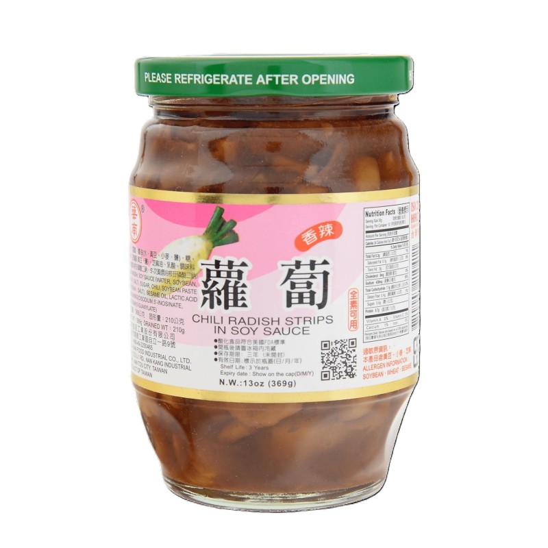 本公司採用日本裂葉種青皮群特級蘿蔔,經過數道工序醃製而成之脆嫩原料蘿蔔,佐以老罈豆瓣與辣椒精心製造之華南香辣蘿蔔香脆可口。