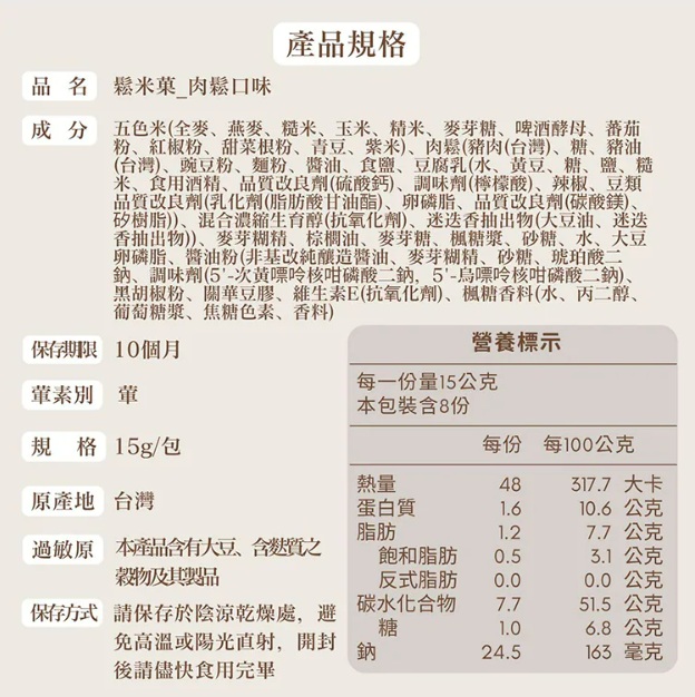 • 五色穀物低溫烘焙,酥脆營養