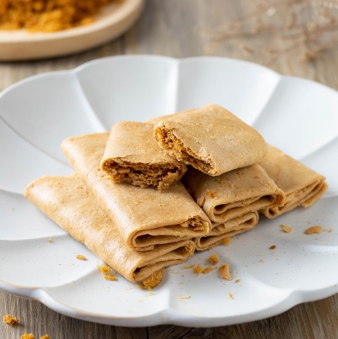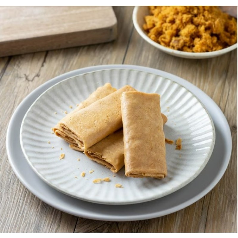 With thin egg crisps folded and rolled into a flat, rectangle shape and filled with high quality dried fish floss.