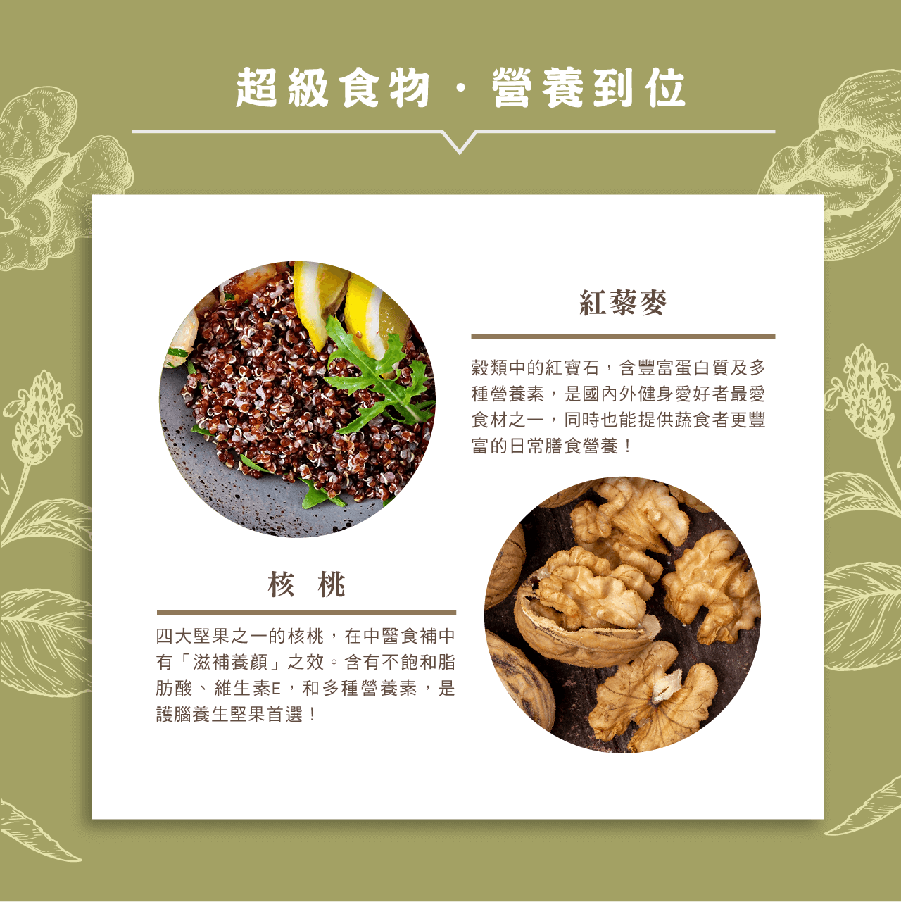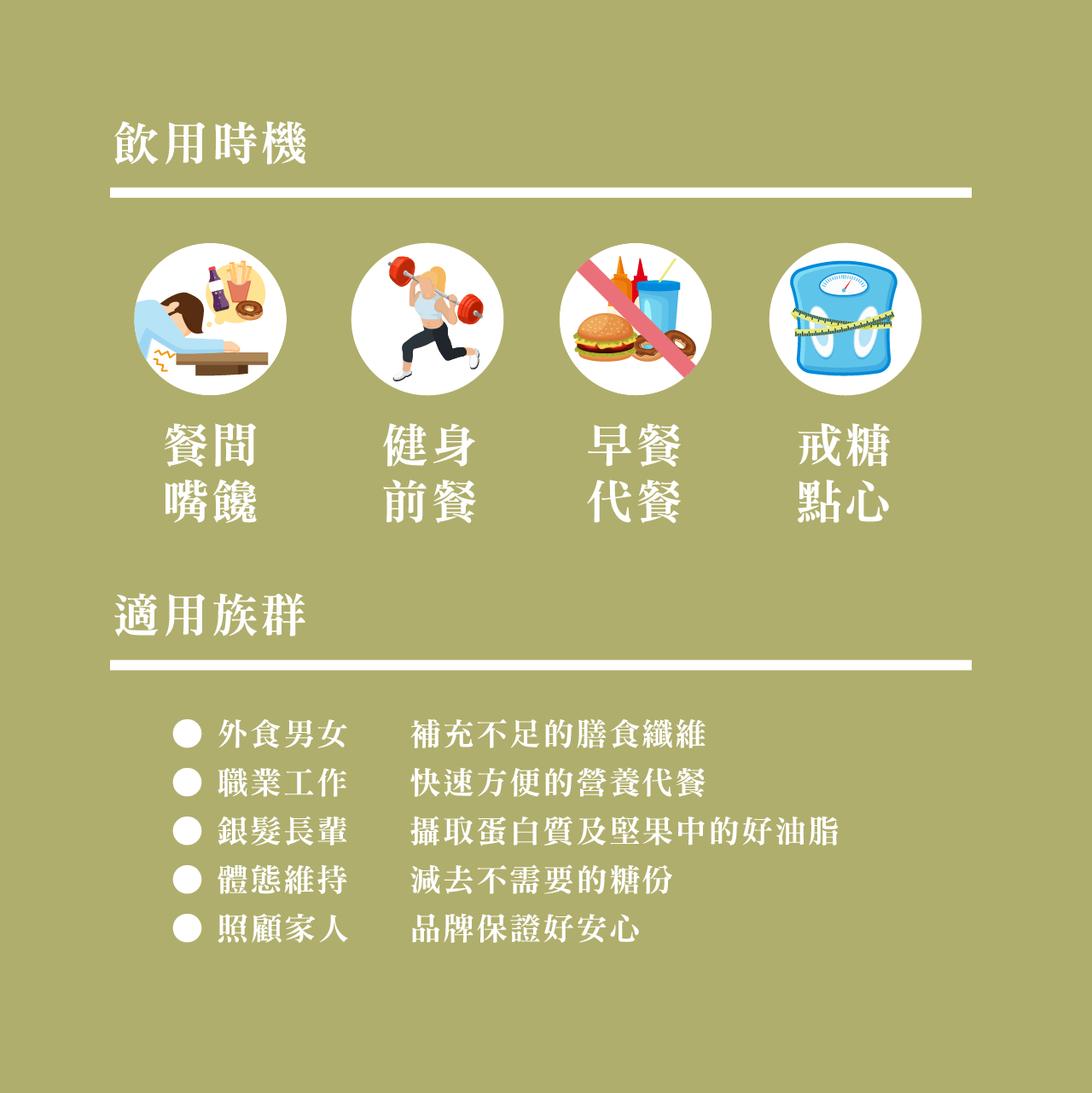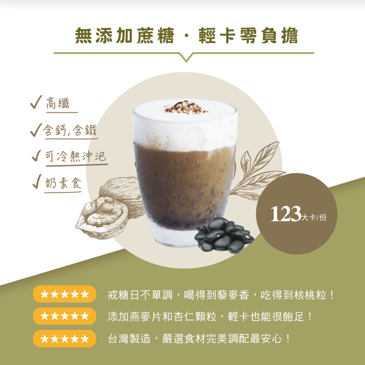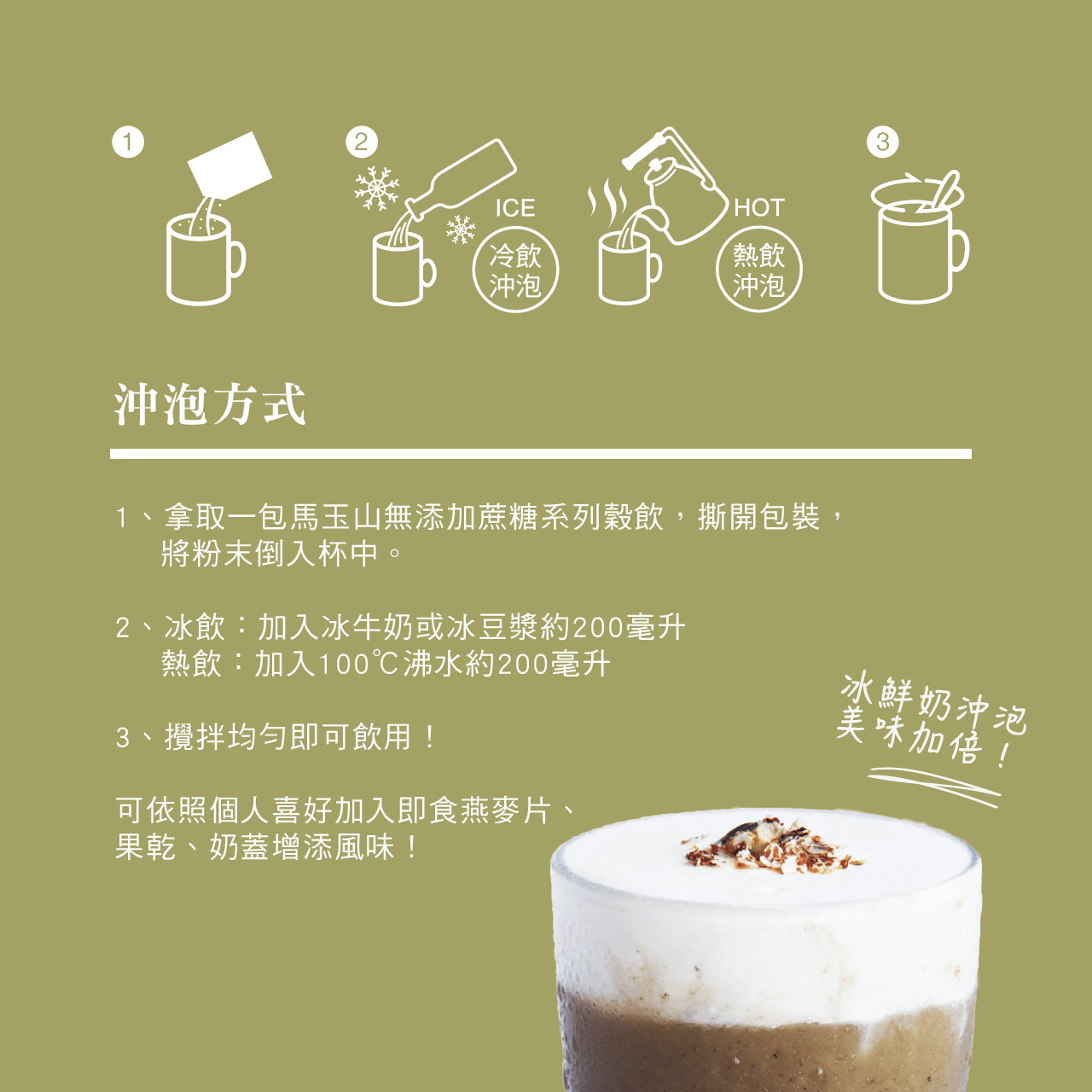 • 特別添加紅藜麥片、黑豆、杏仁及核桃顆粒,使用冰鮮奶沖泡,美味加倍!