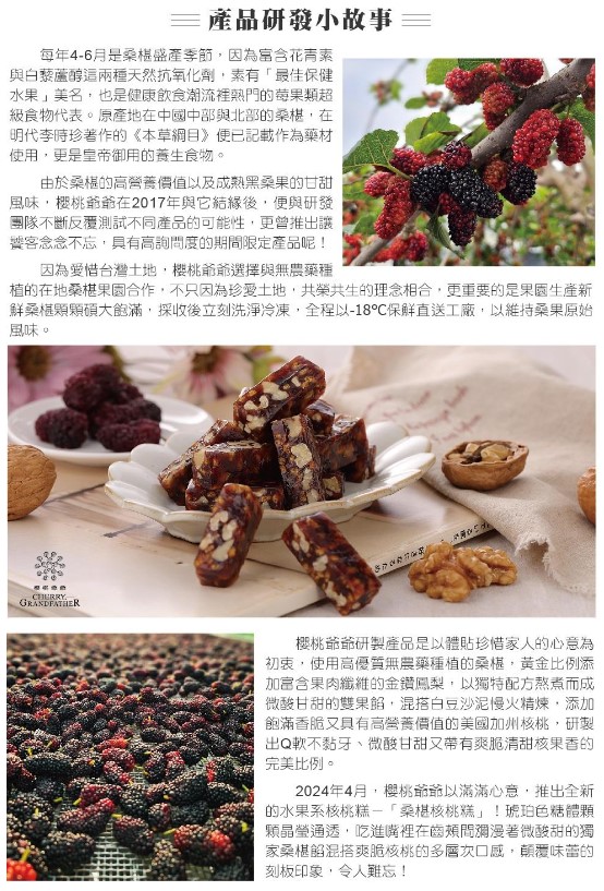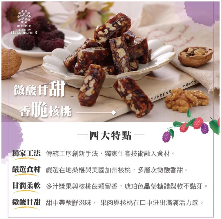 多層次微酸甘甜桑椹餡混搭爽脆核桃,Q軟不黏牙,安心的好滋味!